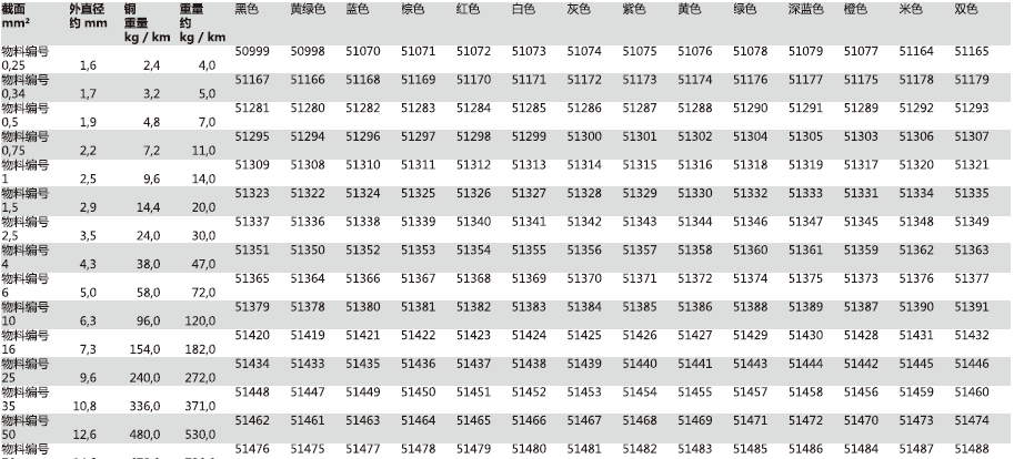 无卤单芯,增强的耐热性 温度范围:移动安装-35℃至+120℃ 固定安装-55℃至+145℃ 标称电压:至1mm²=300/500V 自1.5mm²=450/750V 固定且带保护的安装:从1.5mm²=600/1000V 测试电压:3500V 绝缘电阻:最小10 MOhm*km 最小弯曲半径:移动安装12.5*芯数Φ 固定安装4*芯数Φ 认证:德国劳氏船级社